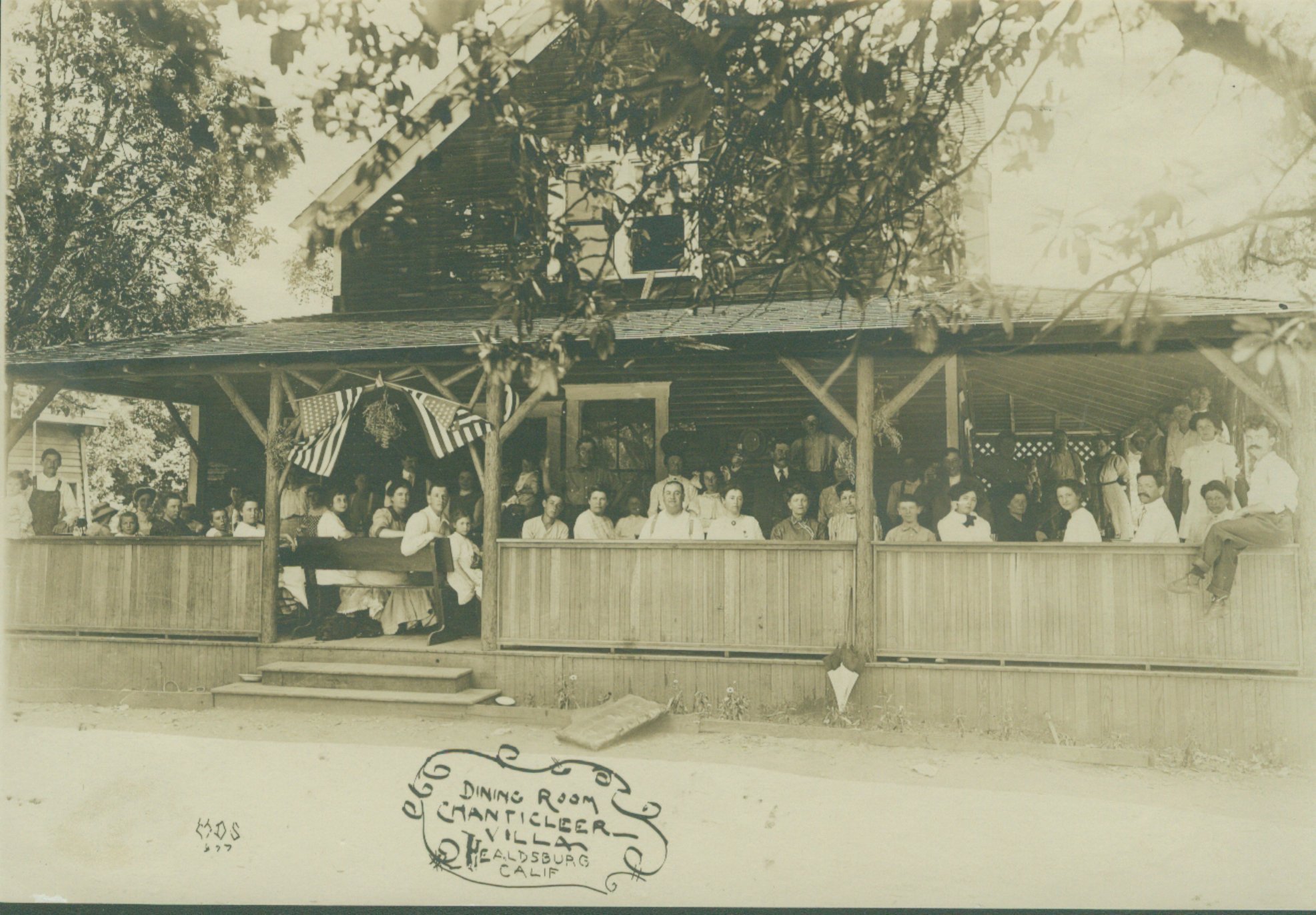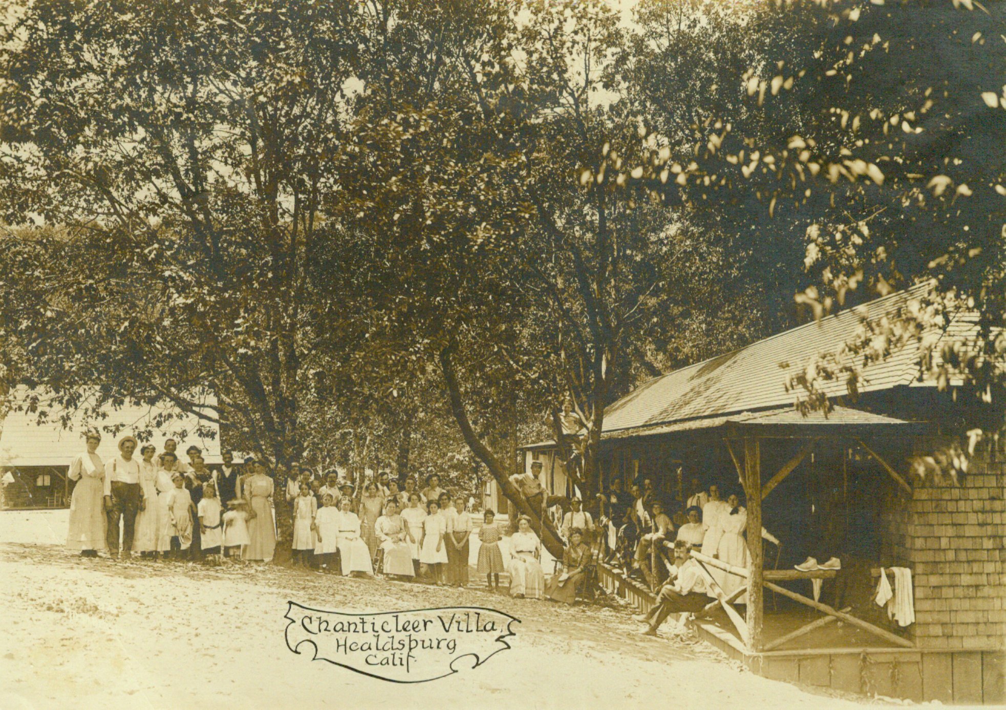In 1916 Victor Cadoul and his wife Seraphie purchased the Chantecler Resort (renaming it the Villa Chantecler) for ten dollars in gold coin from the Pradels and expanded the facilities. An article in the June 18th edition of HEALDSBURG TRIBUNE headlined: “THE VILLA ENJOYS BIG RUN” told that there were “nearly 100 guest enjoying the pleasant surrounding and merchants report business in every line with the guest of Chantecler.” (sounded like the merchants got their road investment back). The building had a kitchen and a bar. The dining area was a large screened-in porch on the north side. Cabins were on the east side of the grounds (eventually rooms were built in one of the buildings to accommodate the large number of “single” guests). Overflow guest were put up in tents. It was about this time that the custom of taking guests on a weekly trip to the Italian-Swiss Colony at Asti began.